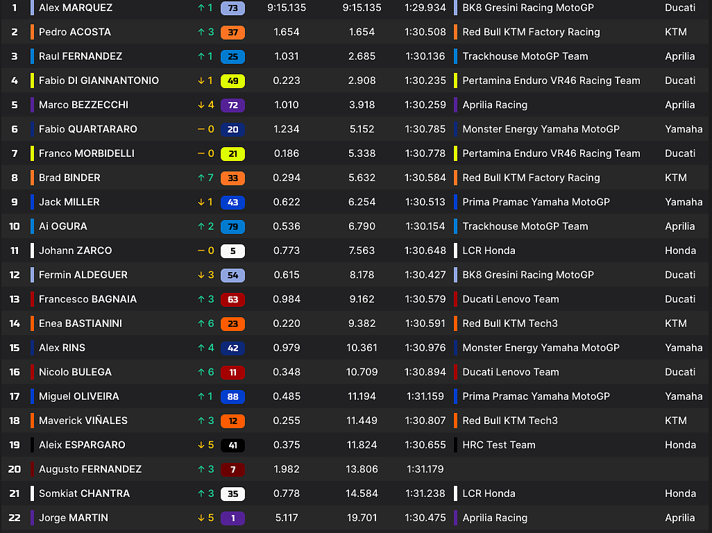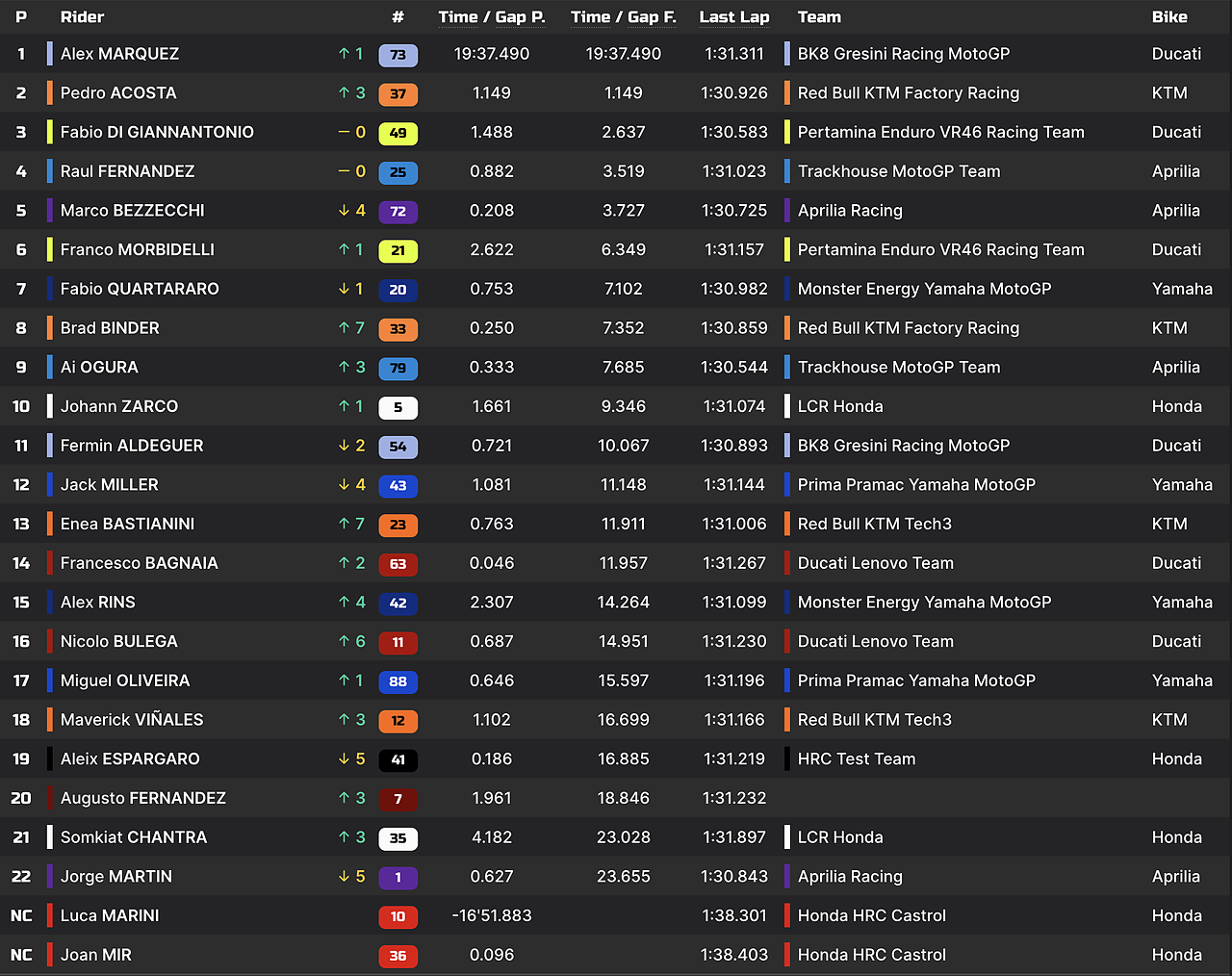 Marquez davanti gestisce il ritmo e solo ora è salito sopra l'1.30, dietro di lui Acosta è a distanza di sicurezza, con Fernandez e Diggia che si giocano il podio e con Bezzecchi che è sempre a 1"1 da Diggia. Quartararo invece si difende su Morbidelli, chiudono la zona punti Binder e Miller che deve difendersi su Ogura. Bagnaia è 13°