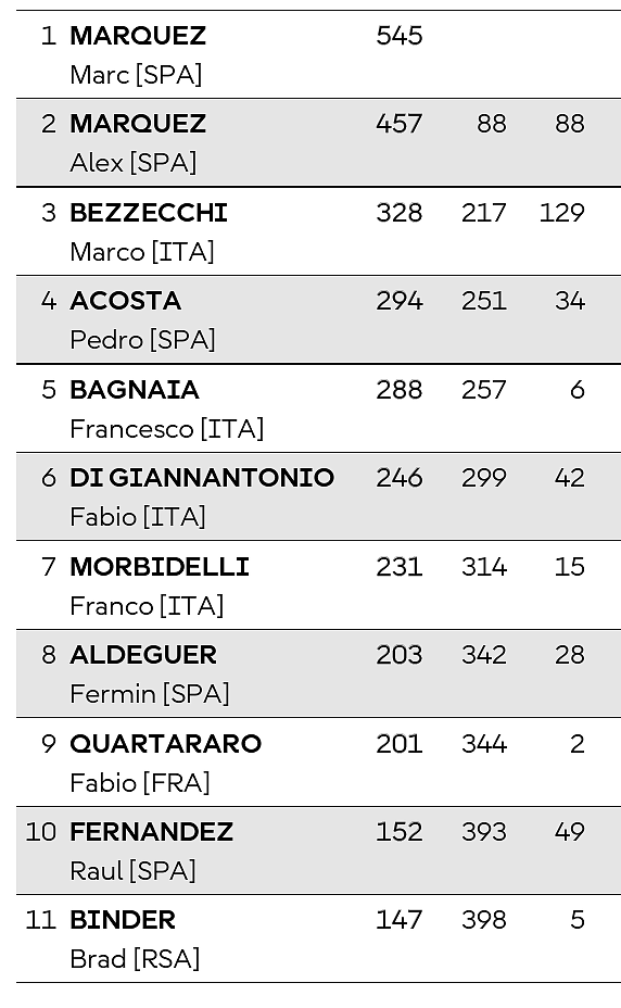 Classifica del Mondiale tutta da decidere per alcuni piazzamenti: detto del terzo posto blindato da Bezzecchi, Acosta domani dovrà difendere il quarto su un Bagnaia in difficoltà. Diggia invece deve difendere il suo sesto posto su Morbidelli, mentre Quartararo andrà a caccia dell'ottavo posto di Aldeguer.