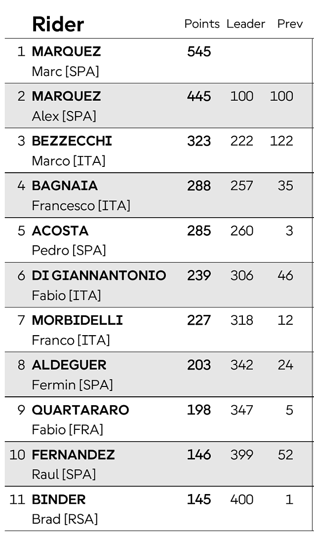 Questa è la classifica piloti che vede Bezzecchi portare, come detto, a 35 i punti di vantaggio su Bagnaia, che deve ora guardarsi da Acosta. Diggia consolida il sesto posto che comunque non è certo né su Morbidelli né su Aldeguer.