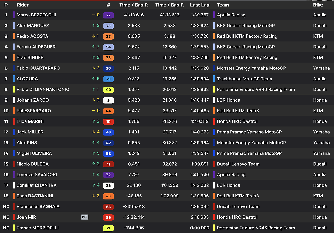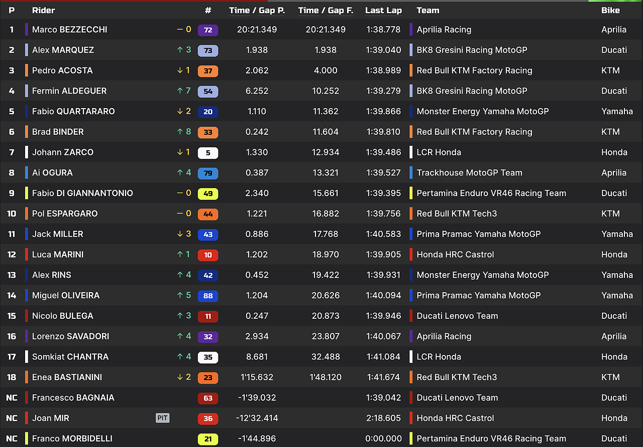 Bezzecchi porta ormai a 2" il suo vantaggio su Marquez girando in 1.38.8. Acosta ormai deve accontentarsi del terzo posto, con Aldeguer a oltre 6" di distacco, mentre Quartararo viene appena passato da Binder in curva 5 per la quinta posizione!