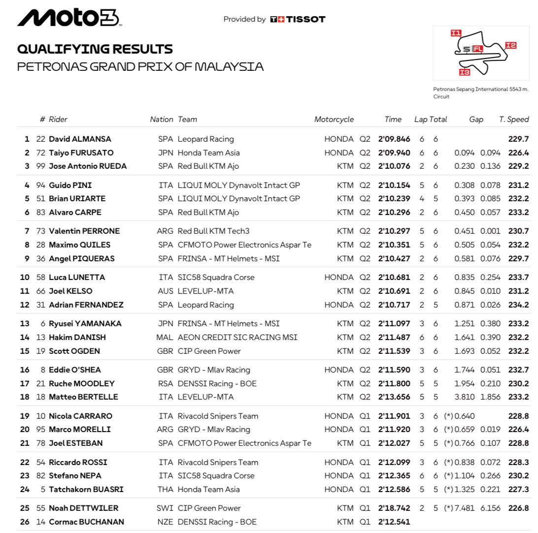 Sulla pista di Sepang è stato David Almansa ad aggiudicarsi la pole position del Gran Premio di Malesia di Moto3, con un tempo di 2:09.846. Il pilota Leopard, con un ultimo giro perfetto, si è assicurato la partenza dalla prima casella in vista della gara di domani. Seconda posizione per Taiyo Furusato, autore di un ottimo giro chiuso in solitaria. Ha chiuso la prima fila José Antonio Rueda. Quarta posizione per Guido Pini, seguito dal compagno di squadra Brian Uriarte, che è però a rischio penalità per un impeding. Sesta posizione per Alvaro Carpe, che ha preceduto Valentin Perrone e Maximo Quiles. Solo nono Ángel Piqueras, che domani partirà vicino al suo diretto avversario per la seconda posizione iridata. Ha chiuso la Top 10 Luca Lunetta.