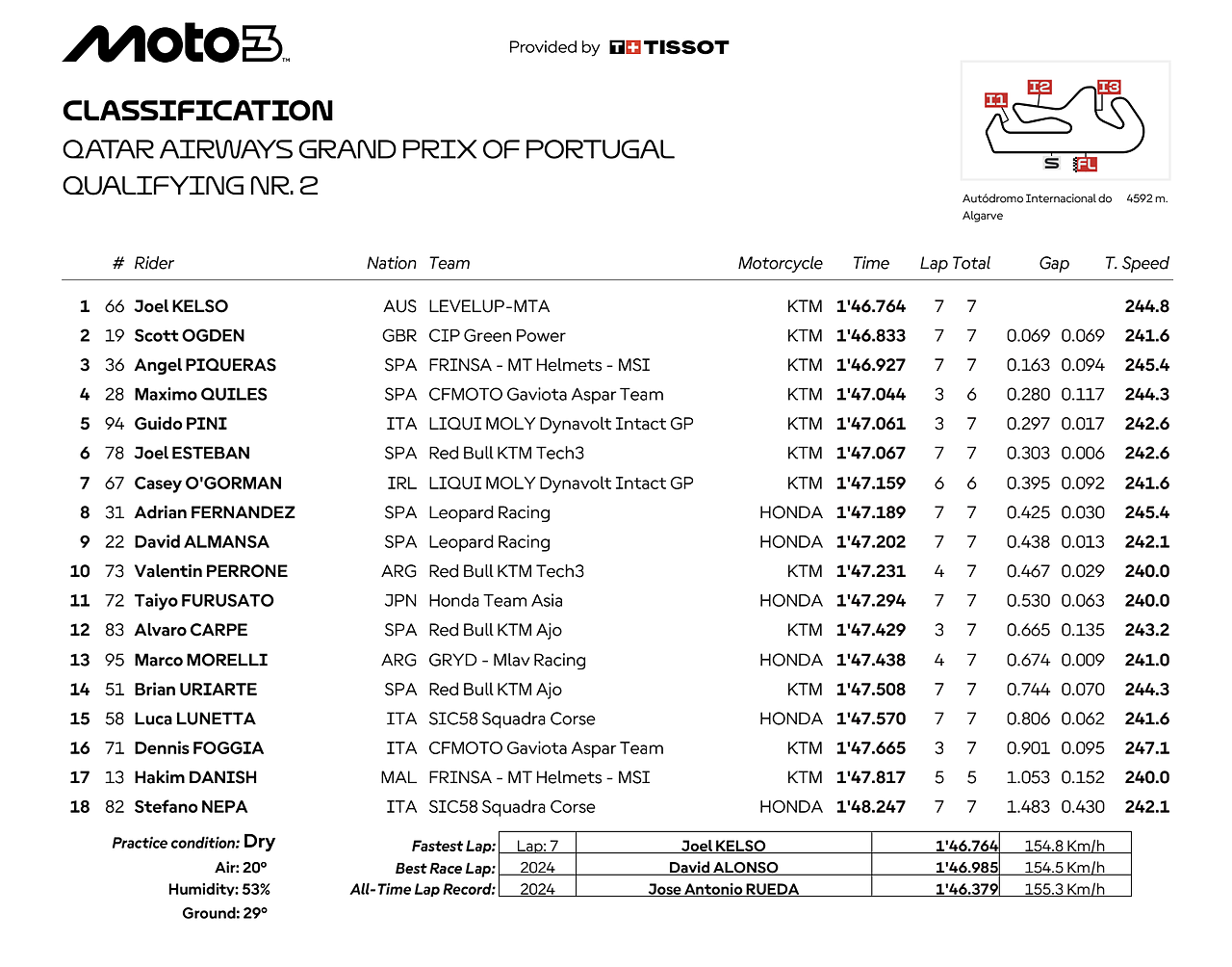 A Portimao Joel Kelso conquista la sua seconda pole stagionale in Moto3 al termine di una sessione senza un vero favorito e aperta qualsiasi risultato: l'australiano di MTA è stato il più bravo e il più furbo a chiudere il suo giro come uno degli ultimi, beffando una ricca concorrenza - su tutti Maximo Quiles.