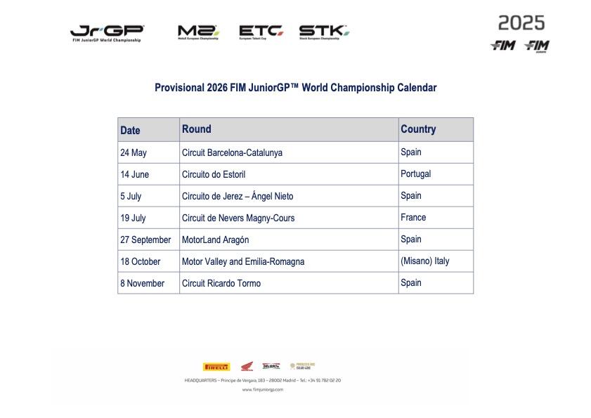 Il FIM JuniorGP ha svelato il calendario provvisorio per la stagione 2026. Rispetto al calendario di questa stagione non ci sono grandi novità per la categoria propedeutica al Motomondiale. I tracciati saranno sempre gli stessi, con ben quattro appuntamenti spagnoli, confermata anche per la prossima stagione Magny-Cours.