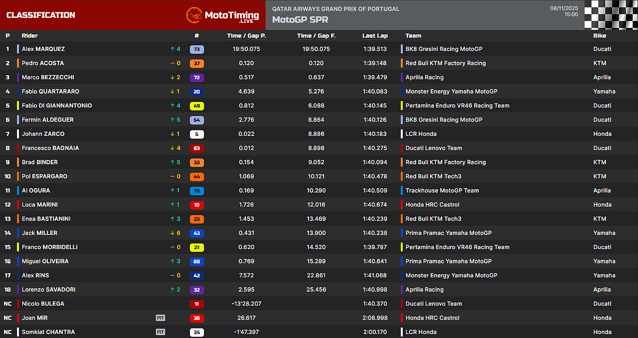 È una Sprint difficile da interpretare quella portoghese. A festeggiare è, ancora una volta, Álex Márquez ormai sicuro della piazza d'onore nel mondiale piloti. Il pilota Gresini Racing non sembrava inizialmente in lotta per la vittoria, ma si è presto avvicinato alla coppia di testa ingaggiando un bel duello con Pedro Acosta. Per più di qualche giro il copione è stato lo stesso: Márquez superava di potenza Acosta sul rettilineo del traguardo, con il pilota KTM in grado di rifarsi nella staccata in discesa di curva 4. Quando Acosta non è più riuscito a replicare, Márquez ha messo il gap giusto per vincere. Il tutto fino all'ultimo giro dove, in un probabile errore non inquadrato dalle telecamere, ha perso diverso tempo ed è stato costretto a difendersi all'ultima curva. Acosta, ancora una volta, è stato beffato: manca la prima vittoria in MotoGP, ma sicuramente il tiburón ci riproverà domani.