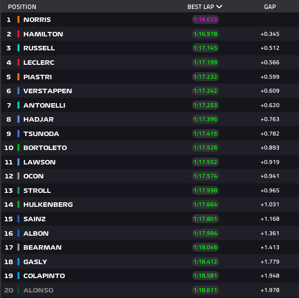 Chiude la top-3 George Russell, distante tuttavia oltre mezzo secondo da Norris con il suo 1.17.145. Russell apre un pacchetto di 5 piloti in poco più di un decimo, con Leclerc a 54 millesimi dall'inglese della Mercedes al quarto posto, seguito poi da Piastri, che paga 599 millesimi di distacco dal compagno di squadra e che ha vissuto un turno non particolarmente semplice che per diverse fasi lo ha visto distante anche quasi un secondo da Norris. Non un segnale positivo per l'australiano, che sta vivendo forse la fase più difficile della sua stagione in un momento chiave per le sue ambizioni iridate.