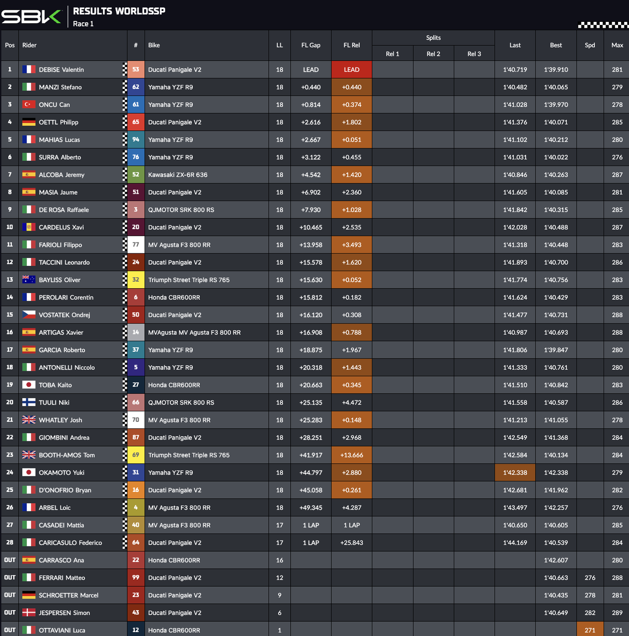 Il coraggio, però, non è bastato, con il turco di Evan Bros che nei km finali ha prestato il fianco a Debise, salito dal terzo al primo posto nell'arco di pochi secondi grazie al doppio sorpasso effettuato a quattro giri dalla fine in curva uno. Il francese ha tenuto sotto controllo la situazione, lasciando Öncü nelle grinfie di Manzi. Confronto tra compagni di squadra che, proprio nell'ultimo giro, si è deciso a favore del leader del WorldSSP, il cui secondo posto potrebbe rappresentare un buon modo per ipotecare il titolo. Manzi ha addirittura provato a chiudere il gap su Debise nel corso del passaggio finale, ma la Ducati non ha perso inerzia e Debise ha potuto festeggiare il secondo successo in tre gare, siglando peraltro il terzo podio consecutivo. Guardando al campionato, domani Öncü sarà obbligato a vincere perché, in caso contrario, a Manzi basterebbe una Top10 per conquistare il titolo.