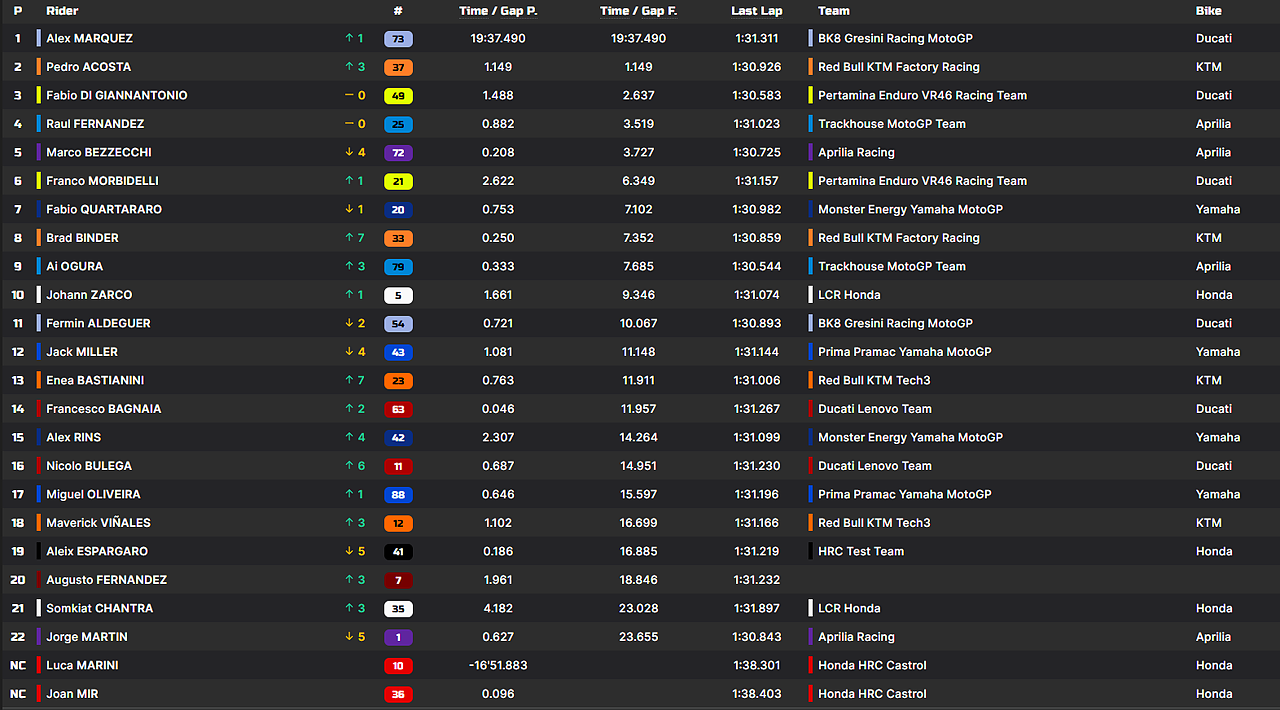 Il più deluso del sabato di Valencia è senza dubbio Marco Bezzecchi: il pilota Aprilia, partito dalla pole position, ha gettato alle ortiche qualsiasi possibilità di lottare per la vittoria dopo poche curve. Uno stacco della frizione di certo non eclatante ha fatto perdere al riminese cinque posizioni in poche curve, con Bez capace di rifarsi solo su Fabio Quartararo (7°) e chiudere 5°. Poco male, dato che è ufficiale il 3° posto nella graduatoria mondiale per il pilota Aprilia. Sesta posizione per Franco Morbidelli, mentre Brad Binder e Ai Ogura chiudono la zona punti. Jack Miller, a lungo 9° classificato, è stato prima penalizzato con un “drop 3 positions” per il contatto con Fermín Aldeguer, penalità poi convertita in un Long Lap Penalty. Il pilota Yamaha ha chiuso 12° proprio dietro al ducatista. Disastro in HRC: al secondo giro Joan Mir stende il compagno Luca Marini in curva 2 con una staccata senza senso. È 22° Jorge Martín, complice di un errore in curva 8 dopo un'ottima partenza.