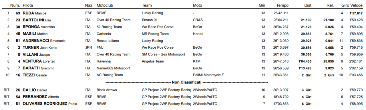 La stagione del Dunlop CIV Moto3 non poteva che finire con una vittoria di Marcos Ruda. Il bi-campione italiano in carica della categoria ha completato un en plein di tutto rispetto: sei vittorie consecutive per chiudere un'annata dominata nella seconda parte della stagione. Il pilota Lucky Racing Team ha chiuso la corsa con 21" di vantaggio su Elia Bartolini e Valentino Sponga. I due, con Sponga caduto giusto davanti a Bartolini in Gara 1, hanno dato vita ad una bella battaglia per il podio. Uscito 3° dalla Bucine, Bartolini ha sverniciato sotto alla bandiera a scacchi il pilota We Race Pos Corse per conquistare il secondo podio in poche ore dopo la Sportbike. Grandi assenti i piloti 2WheelsPoliTO: i tre alfieri del progetto piemontese non hanno visto il traguardo a causa di problemi tecnici.