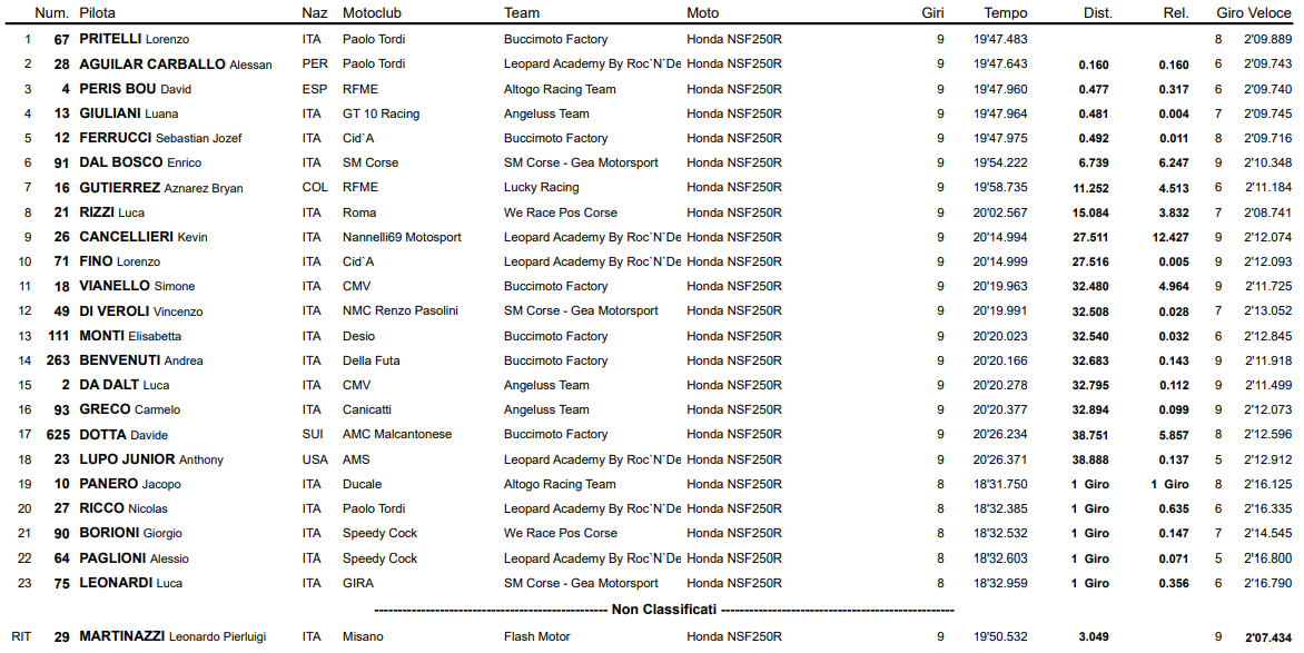 Pritelli, superato da Alessandro Aguilar Carballo nel primo settore, è stato graziato dal regolamento. La classifica è stata stilata in base alle posizioni sotto la bandiera a scacchi, dove Pritelli è transitato davanti al pilota Leopard Academy by Roc'N'Dea. Terzo gradino del podio per David Peris Bou, grande protagonista nella lotta del gruppo di testa. Quarta posizione per Luana Giuliani, che festeggia così la 4ª posizione in campionato.