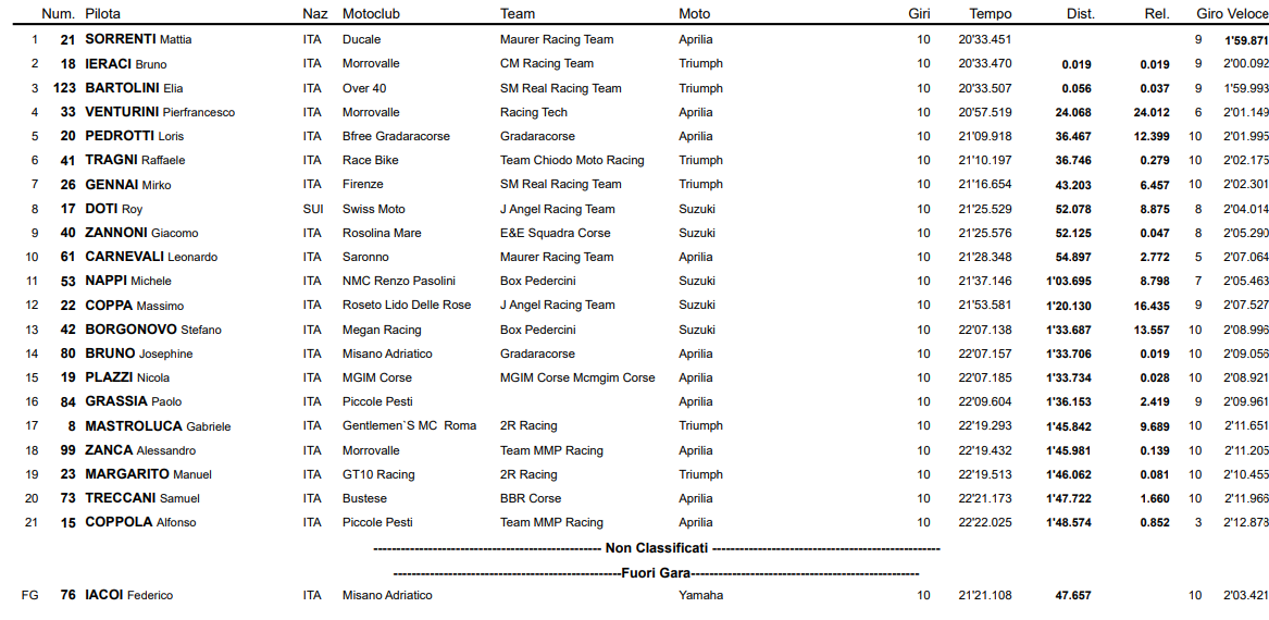 Non ha vinto il titolo, ma Mattia Sorrenti ha smaltito la delusione con la vittoria della manche finale del Dunlop CIV Sportbike. Il pilota Aprilia, squalificato da Gara 1 insieme al compagno di squadra Leonardo Carnevali per irregolarità tecnica, è partito all'arrembaggio salvo poi farsi riprendere dal campione della categoria Bruno Ieraci e da un sostituto di lusso come Elia Bartolini. I due piloti Triumph non sono riusciti a superare la RS660 di Sorrenti sul rettilineo finale, dovendosi così accontentare del 2° e 3° posto. Un podio per festeggiare il titolo per il primo, mentre Bartolini si toglie una bella soddisfazione al debutto nella categoria in un weekend che lo ha visto impegnato anche in Moto3. Quarta posizione, nonostante il Long Lap Penalty, per Pierfrancesco Venturini.
