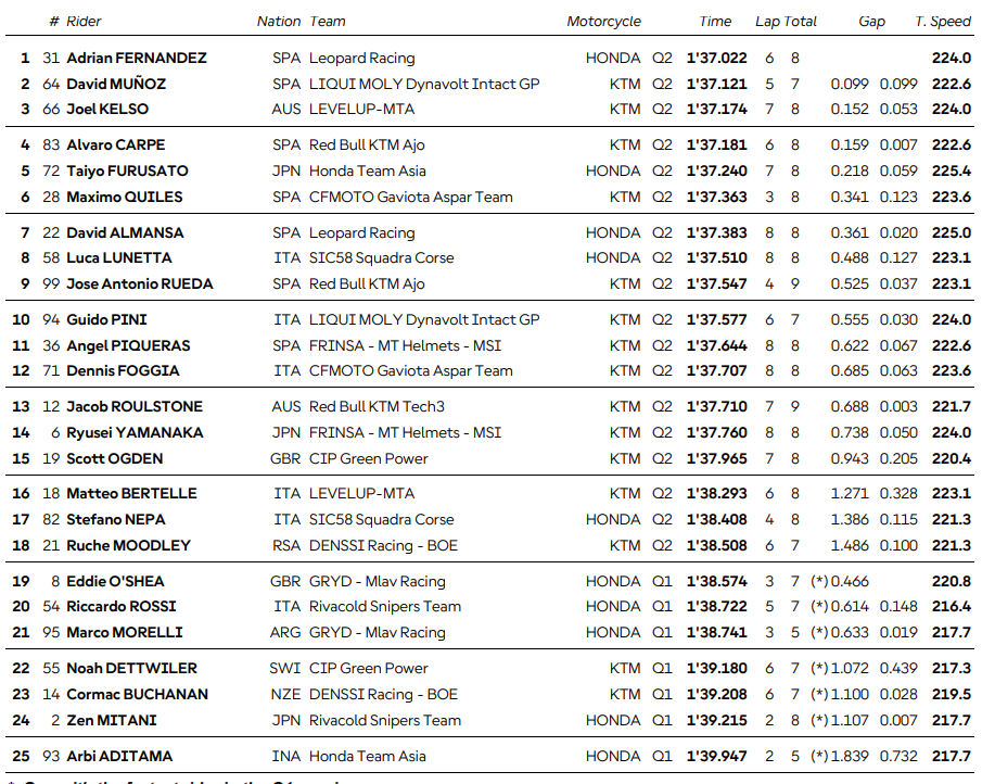 Ispirato dalla prima fila del fratello Raúl in MotoGP, Adrián Fernández torna a partire dalla prima posizione per la prima volta da Sepang 2024. Un digiuno durato quasi un anno, ma il ritorno in pole position non arriva a caso. Lo spagnolo ha trovato un accordo per correre anche nel 2026 con Leopard Racing, affiancando Guido Pini (annunciato a Misano, ndr). Fernández ha vinto la concorrenza del compagno di squadra David Almansa, che passerà in IntactGP con David Muñoz. Proprio il #64, vincitore di Motegi, affiancherà il poleman sullo schieramento di partenza in virtù del secondo tempo conquistato negli ultimi minuti di Q2. Prima fila completata da Joel Kelso, che affronterà le ultime gare in KTM prima di passare sulla Honda di MLav Racing.