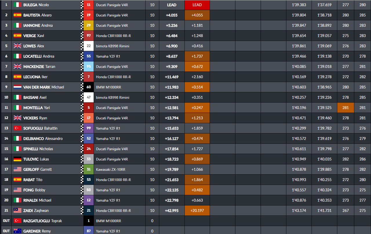 Si è deciso tutto in curva 5: Toprak Razgatlıoğlu ha avuto uno scatto migliore e si è preso la prima posizione. Arrivati in curva 5, dove Nicolò Bulega ha dimostrato per tutto il weekend di essere più veloce, il ducatista ha cercato di riprendersi la testa della corsa. Il #11 si è infilato all'interno, toccando il rivale di BMW: il contatto è evidente, così come la caduta del leader del campionato al quale sarebbe bastato arrivare sul traguardo a punti per laurearsi campione del mondo per la terza volta. La decisione dei commissari di gara è quasi immediata: un Long Lap Penalty comminato all'inseguitore nella lotta iridata, che riesce agilmente a completare mantenendo un vantaggio siderale rispetto alla concorrenza.