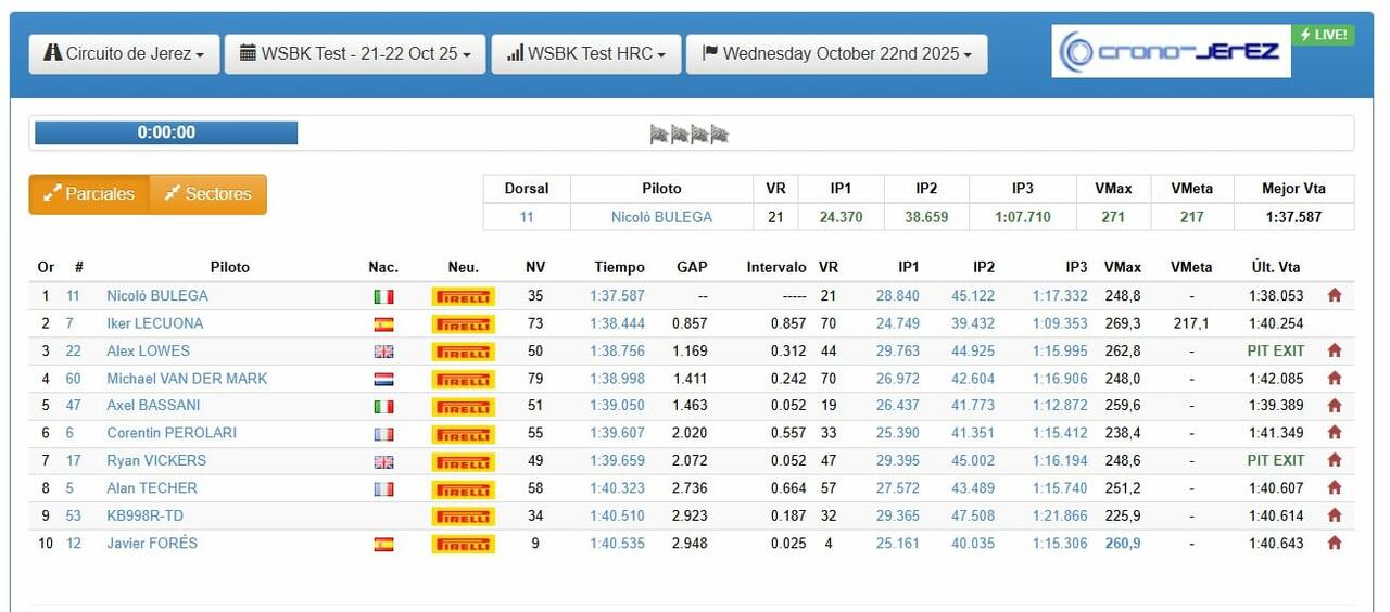 Chiusi i cancelli del circuito di Jerez de la Frontera, anche i test del WorldSBK si possono considerare conclusi. Nella seconda giornata andalusa è ancora Nicolò Bulega a svettare con un margine cospicuo sul compagno di squadra Iker Lecuona. Dietro i due ducatisti c'è Alex Lowes su Bimota.