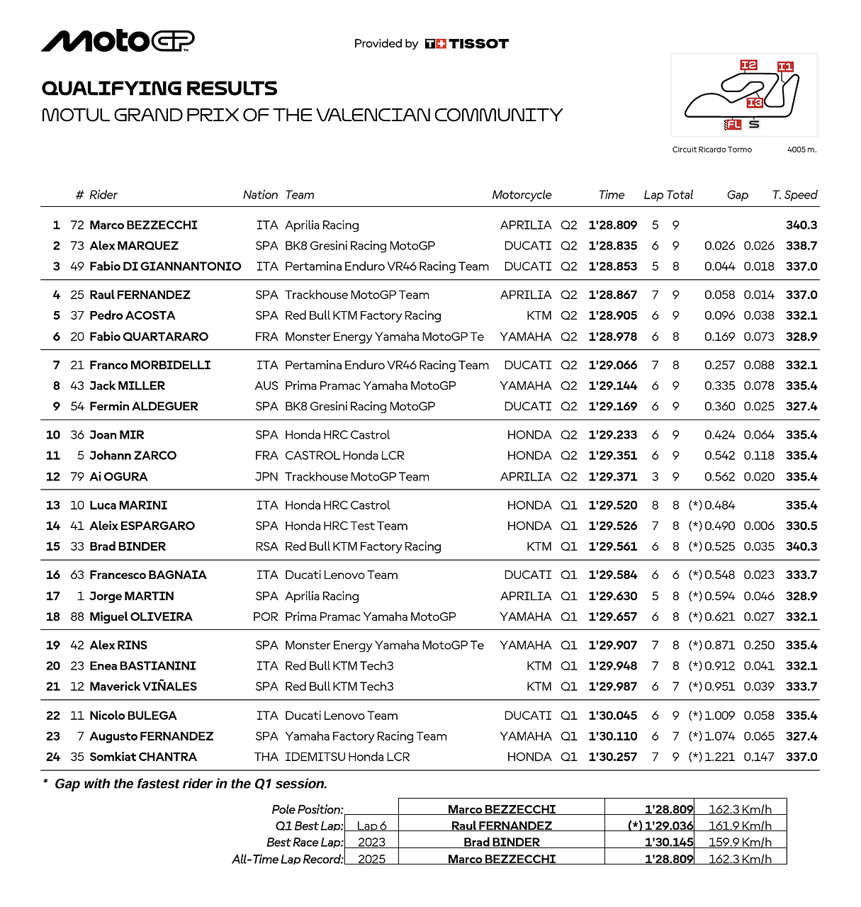 L'1.28.809, che rappresenta anche il nuovo record all-time del circuito di Valencia, consente a Bezzecchi di conquistare la sua quinta pole nelle ultime 10 gare (e anche la quinta della stagione) e la seconda consecutiva dopo quella di Portimao di 7 giorni fa.