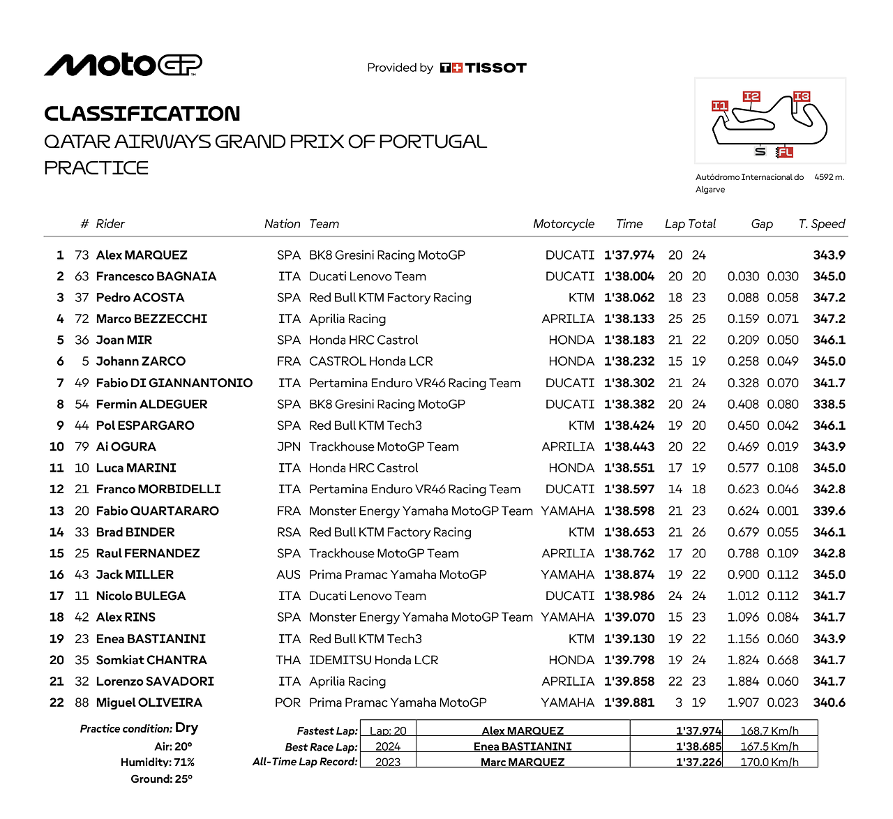 Quarto tempo per Marco Bezzecchi che nel finale si è conquistato la top-10 con un 1.38.133 che lo lascia a un decimo e mezzo circa da Márquez: il riminese di Aprilia precede le due Honda di Mir e Zarco, con lo spagnolo che prosegue nella sua fase positiva. Completano la top-10 Di Giannantonio, settimo a poco più di 3 decimi dalla vetta, Aldeguer, Pol Espargaro con la seconda KTM in Q2 e Ai Ogura con la seconda Aprilia qualificata direttamente alla seconda fase della qualifica.