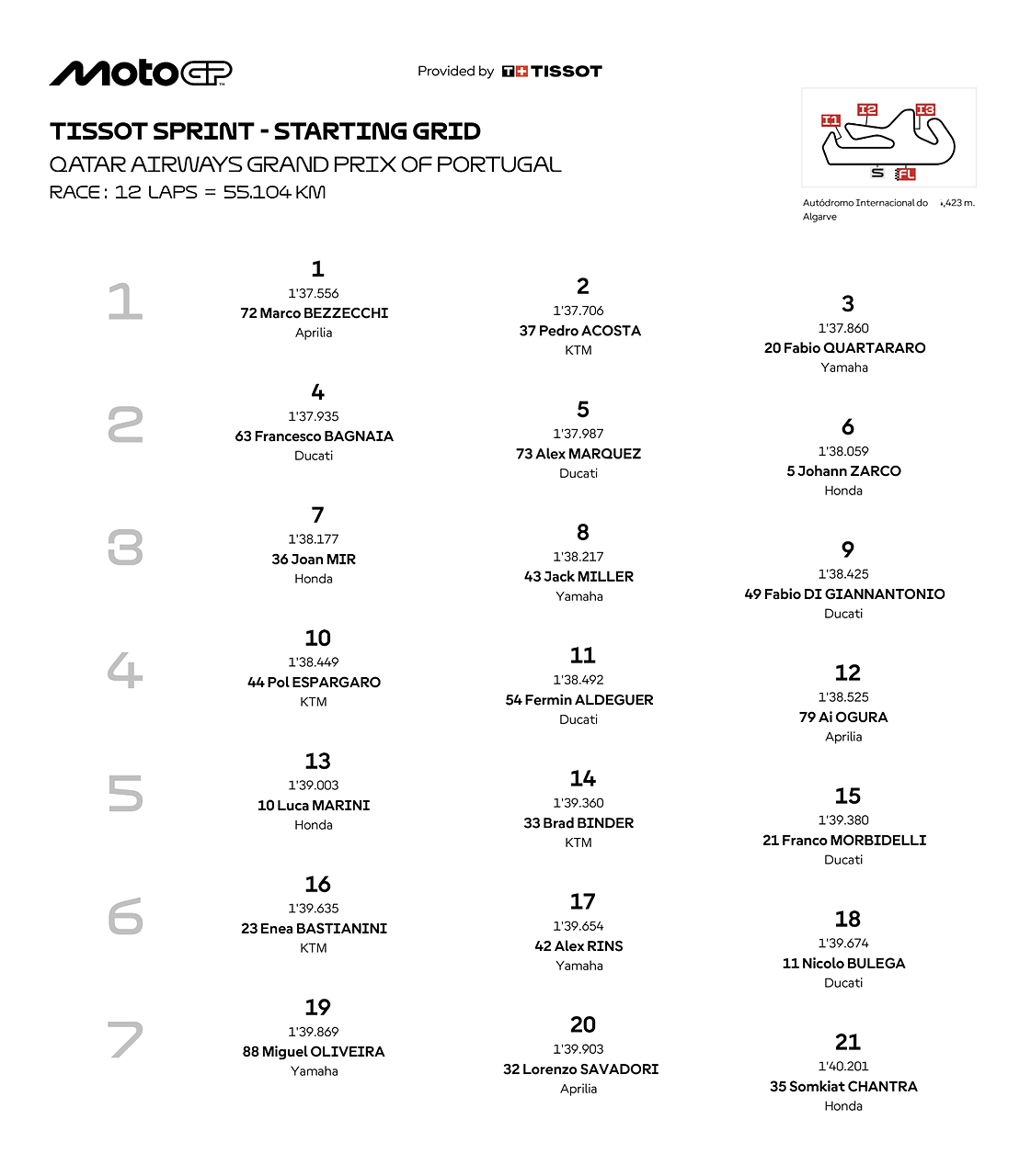 Ecco la griglia di partenza con Bezzecchi che parte dalla pole davanti ad Acosta e Quartararo. Bagnaia è quarto davanti ad Alex Marquez e a Zarco. Diggia chiude la terza fila, Bulega invece chiude la sesta fila in 18^ posizione.