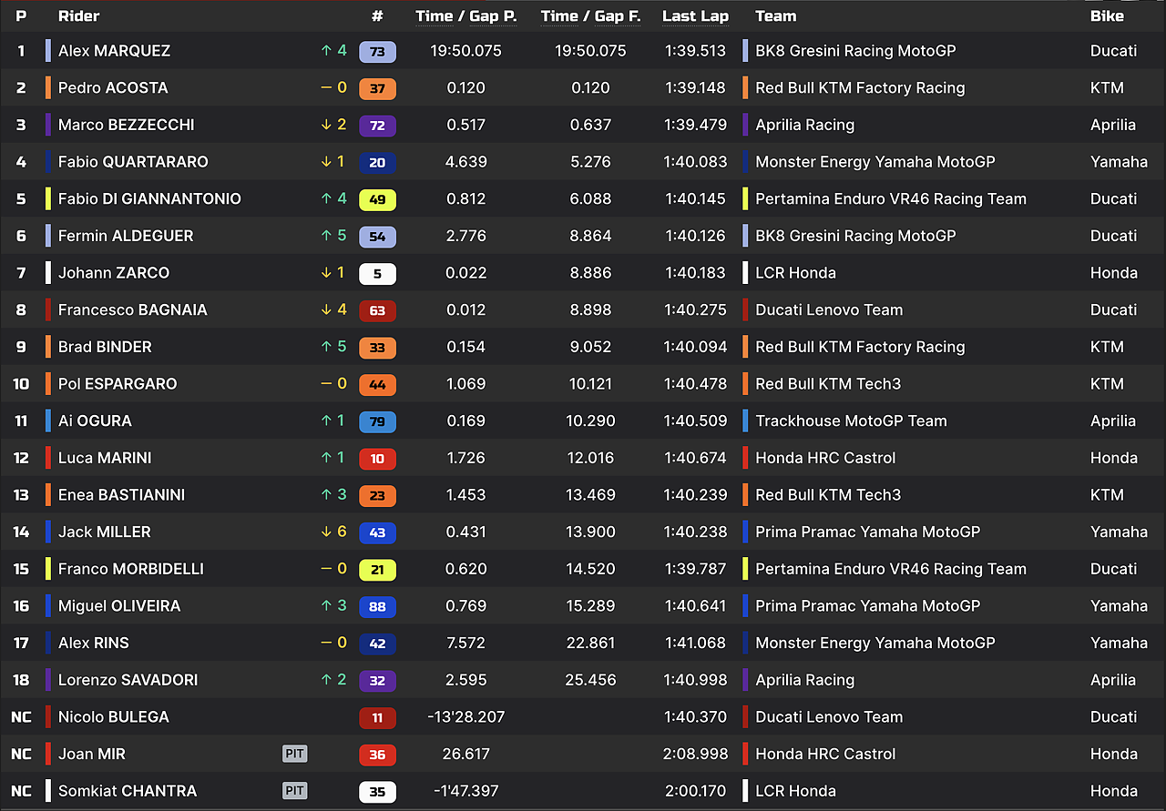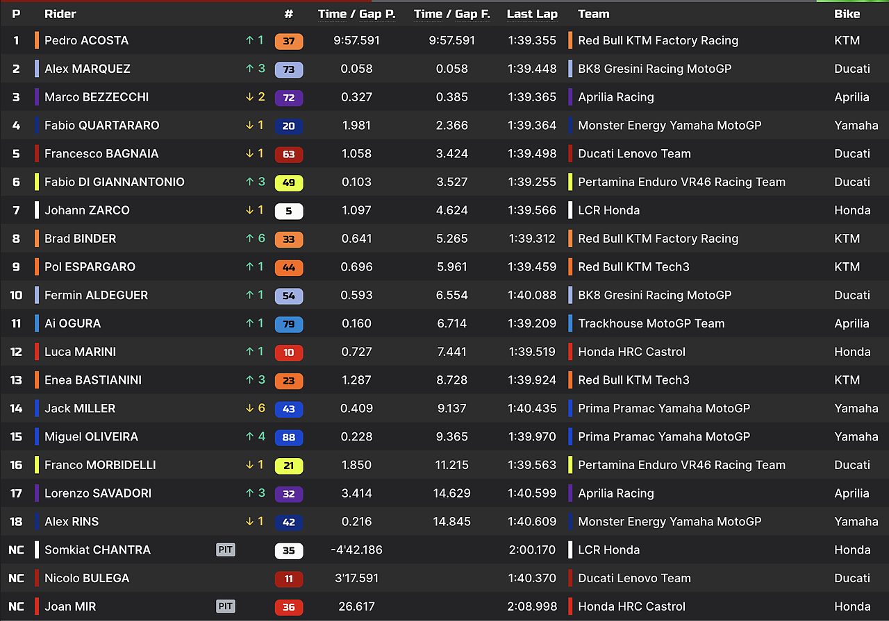 Chiude la top-10 Pol Espargaro, 12° Marini, 13° Bastianini, Morbidelli è 15° mentre chiude la classifica Savadori in 18^ posizione.