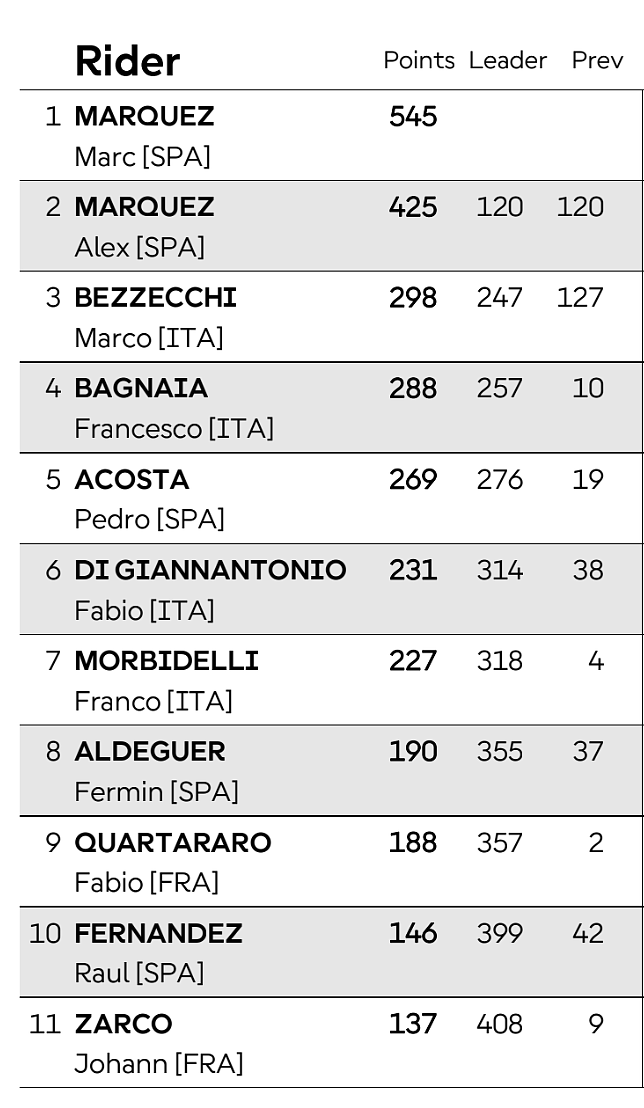 Nel Mondiale Bez allunga in classifica su Pecco - ora a 10 punti di distacco -, mentre perde qualcosa su Acosta, a - 29, nella lotta per il terzo posto.