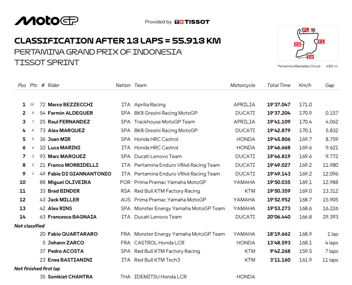 Marco Bezzecchi trionfa nella Sprint Race del Gran Premio d'Indonesia di MotoGP. Dopo le difficoltà in partenza, il #72 ha ricostruito la sua gara e si è imposto davanti a Fermin Aldeguer e Raul Fernández. Disastro per Bagnaia, che ha chiuso ultimo.