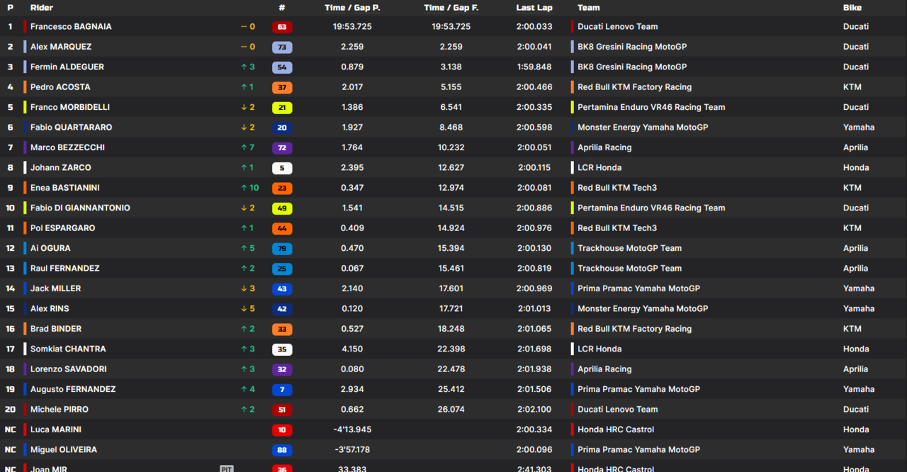 Dietro il quartetto di testa è successo veramente di tutto: a spuntarla è stato Franco Morbidelli, capace di prendersi la 5ª posizione nonostante la partenza dalla prima fila dello schieramento. Sesta piazza per la Yamaha di un sempre presente Fabio Quartararo, capace di mettersi alle spalle un arrembante Marco Bezzecchi. Il pilota Aprilia ha rimontato dalla 14ª posizione arrivata dopo una qualifica molto complicata. Punti buoni in ottica campionato, ma Bez ha perso il terzo posto da Bagnaia per un solo punto. Rivede i punti anche Johann Zarco, in una giornata dove Honda ha visto le cadute sia di Joan Mir che di Luca Marini. Punti anche per Enea Bastianini, capace di riprendersi ben 10 posizioni rispetto alla griglia di partenza. Fabio Di Giannantonio, invece, è 10° e fuori dai punti.