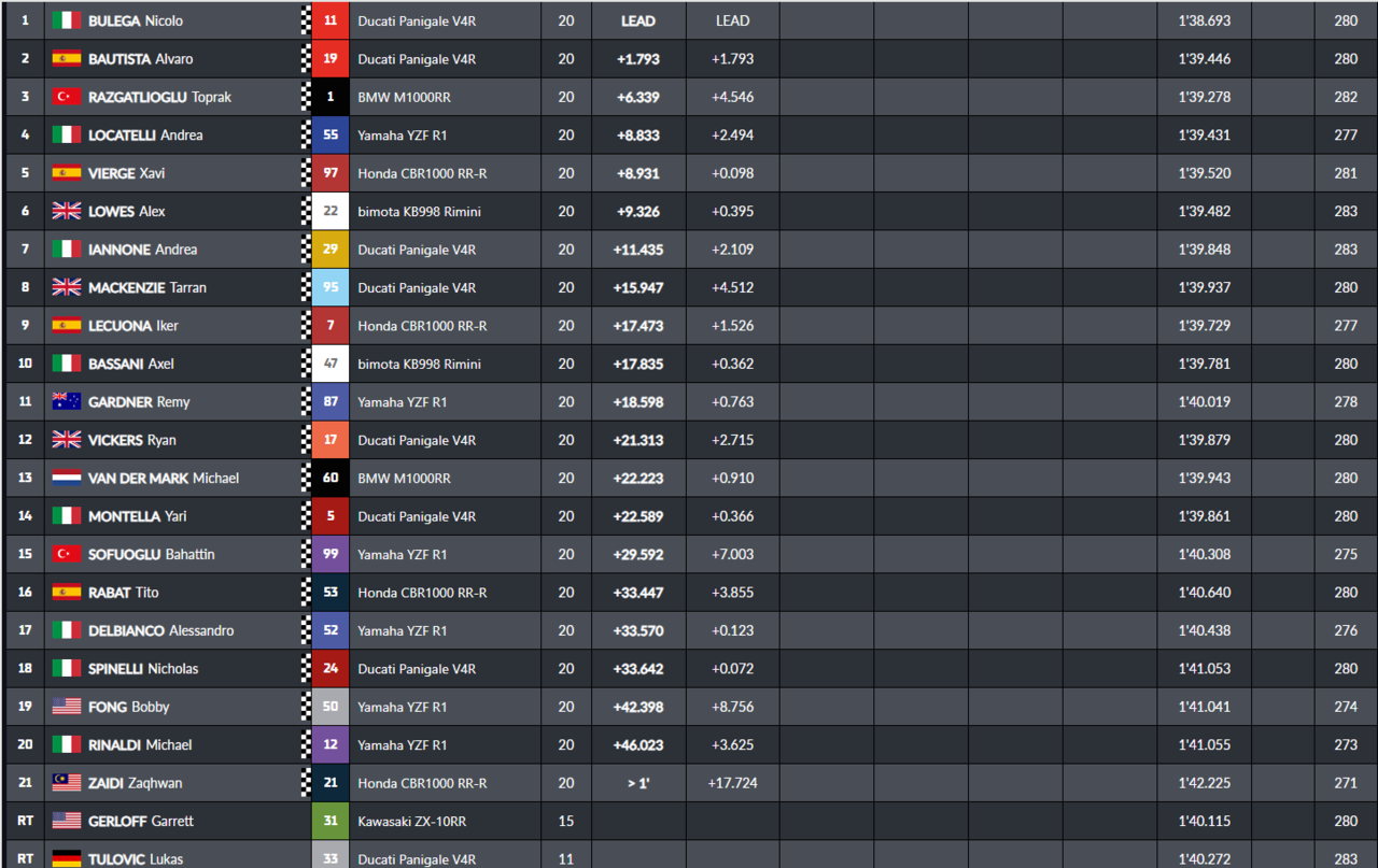 Ci ha provato nelle primissime curve, grazie ad un ottimo start, Álvaro Bautista a mettersi in lotta per la vittoria. Il ducatista ha tentato, anche se per poco, di stare davanti al compagno di squadra. Nel giro di poco il #19 si è dovuto accontentare della piazza d'onore per lasciare la formazione Aruba.it Racing prima di accasarsi al Barni Spark Racing Team da martedì. A proposito di addii, non ha potuto godersi il suo Jonathan Rea. Il sei volte campione del mondo ha innescato la caduta nelle prime fasi della Superpole Race che ha coinvolto anche Remy Gardner. Purtroppo, è stato dichiarato unfit dai medici e non ha potuto prendere parte all'ultima gara di carriera.