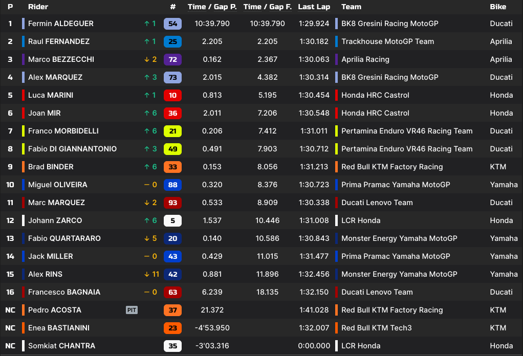 Partenza eccezionale di Aldeguer che prende la leadership ma soprattutto di Marini che ha per un momento preso la leadership e che ora invece si trova quarto. Bez è solo sesto dopo un pessimo inizio.