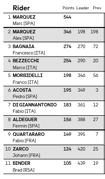 Dietro Morbidelli recupera 2 punti su Acosta e porta il suo vantaggio su Pedro a tre punti, mentre Diggia resta settimo a 15 punti dal compagno di squadra. Aldeguer accorcia su Diggia dal quale ora dista 27 lunghezze: lo spagnolo ha scavalcato Quartararo per l'ottavo posto nel Mondiale.