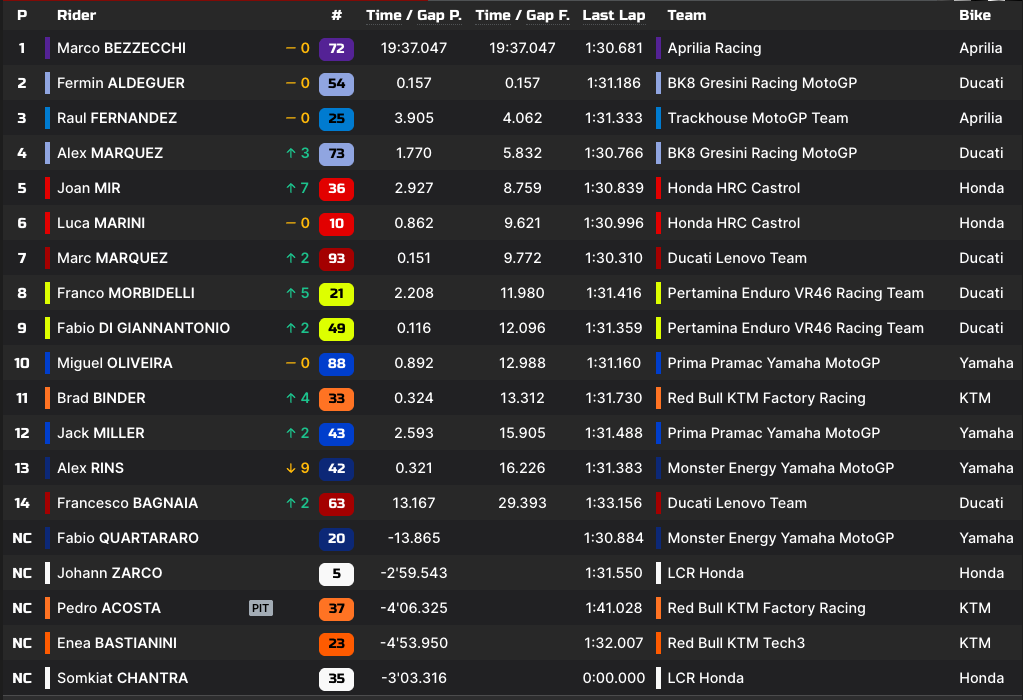 Bez ora è quinto e si sta giocando il quarto posto con Marini, mentre dietro MM93 sconta subito il long lap e adesso è 13° davanti a Miller e Quartararo. Bagnaia invece è addirittura ultimo.
