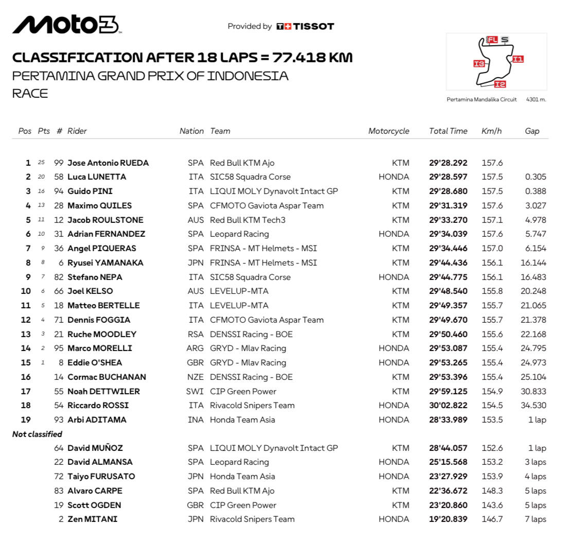 É stato Josè Antonio Rueda a trionfare nel Gran Premio d'Indonesia di Moto3, laureandosi così campione del mondo. Sul podio insieme a lui, Luca Lunetta e Guido Pini.