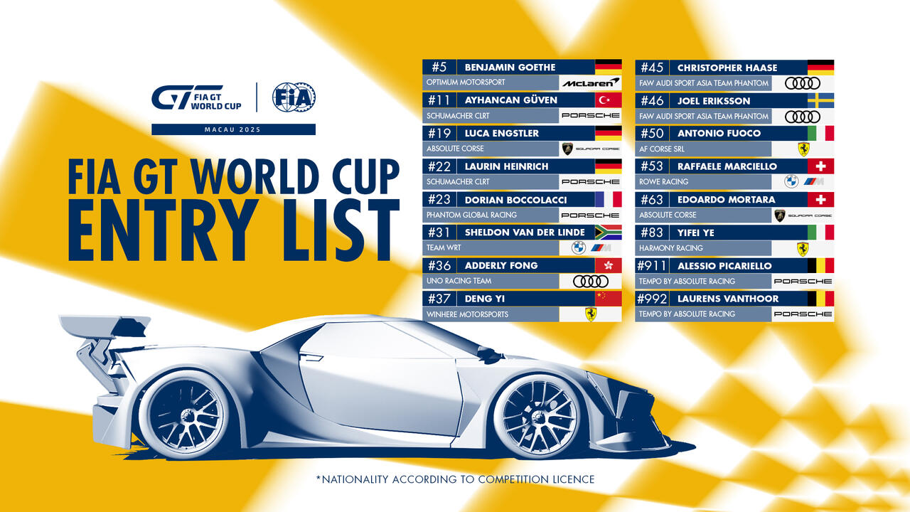 Ad un mese dal GP di Macao 2025 è stata resa nota l'entry list della FIA Formula Regional World Cup, la FIA GT World Cup e l'inedita FIA F4 World Cup. I tre eventi si terranno nell'iconico tracciato cittadino asiatico nel weekend del 15-16 novembre.