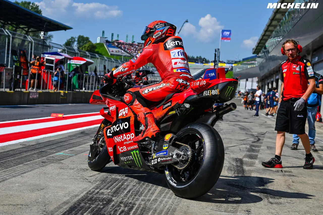 Con il crono di 1:28.117 Marc Márquez si prende il primo tempo nel turno pomeridiano del venerdì. Il catalano è a caccia dell'ennesimo primato di un 2025 fino a questo momento ai limiti della perfezione. La sessione di Practice è stata interrotta da una bandiera rossa a metà turno causata da un patatrac firmato Yamaha: il problema tecnico di Jack Miller ha causato le cadute di Fabio Quartararo e Miguel Oliveira. Nessun problema per il leader del campionato, che ha chiuso con due decimi di vantaggio nei confronti di Pedro Acosta. Il pilota KTM sembra aver tratto un beneficio cospicuo dagli aggiornamenti portati dalla casa madre al Gran Premio di casa, facendo segnare il secondo crono. Terza posizione per un ritrovato Francesco Bagnaia, stranamente veloce al venerdì austriaco.