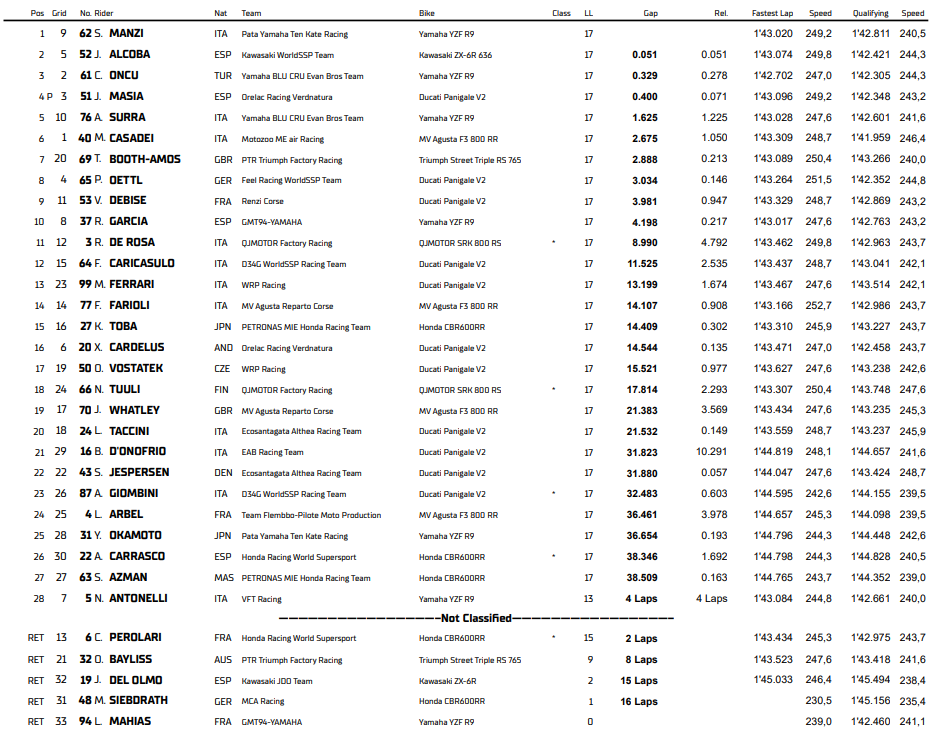 Si è risolta all'ultimo giro Gara 1 WorldSSP con un brivido anche dopo la bandiera a scacchi. Stefano Manzi si è preso con una spallata l'undicesimo successo stagionale nei confronti di Jeremy Alcoba, arrembante sulla Kawasaki 636. Podio, deciso a tempo scaduto, per Can Öncü grazie all'infrazione di Jaume Masiá.